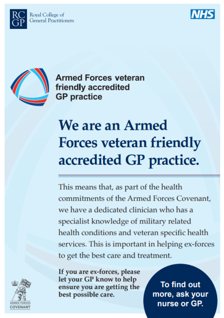 At our practice, we are proud to be officially recognised as a Veteran Friendly GP Practice. This means we are committed to providing the best possible care and support to those who have served in the UK Armed Forces.